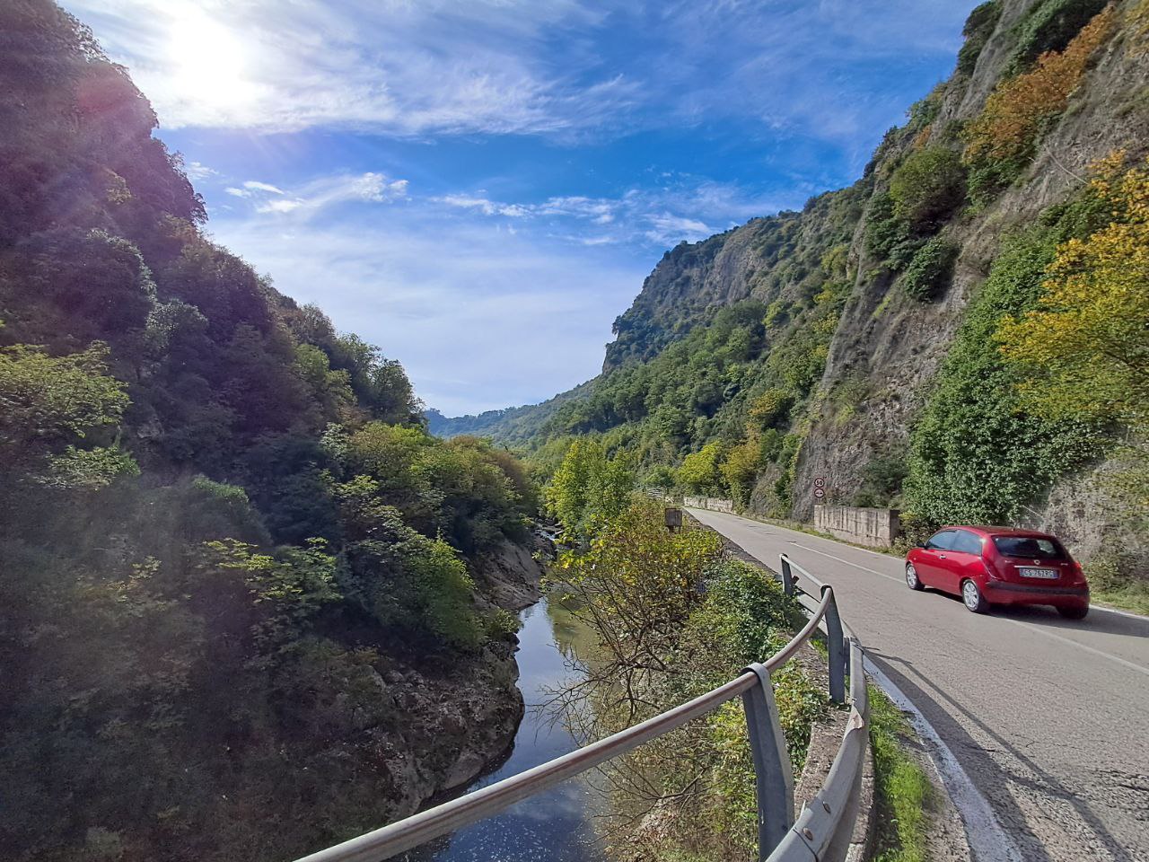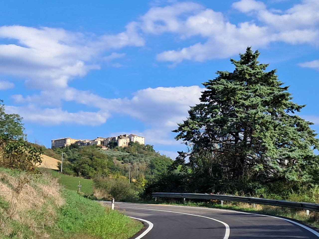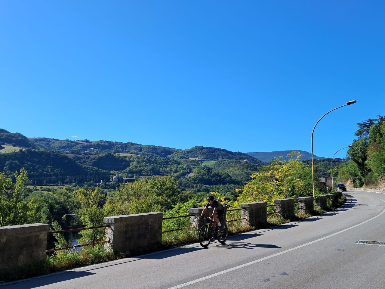 Река называется Metauro. Спасибо ей за относительно мягкий проход через основной хребет Аппенин. Её не видно, но она на этом фото есть. Река — лучший друг колесаря!
